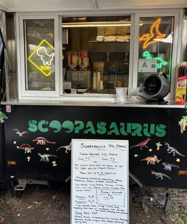 Welcome to the newest food stop on Daufuskie, Scoopasaurus! Open now Thurs-Sun, 11 am-4 pm for ice cream cups and cones. They also have snacks, candy bars, cake by the slice, and slushies. Quarts of ice cream are also available. Located off Buckthorn Rd., they are set up in the little black food truck next to the yellow warehouse in front of UpnSmoke BBQ.